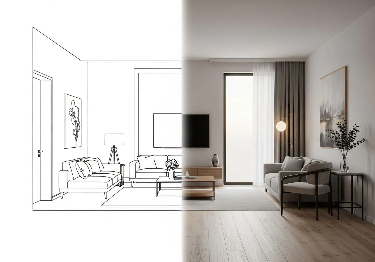 Una vez definido la organizacion espacial y volumen, el siguiente paso es estilizar. Tradicionalmente, el proceso de texturizado, amueblado y renderizado consume horas. La IA lo está reduciendo drásticamente en dos niveles: